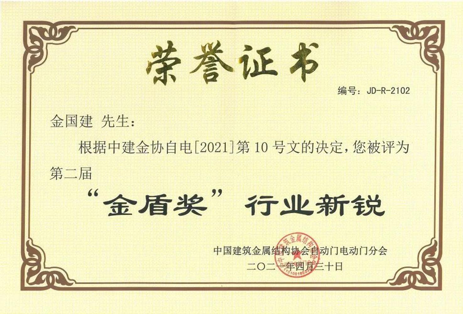 “金盾獎(jiǎng)‘行業(yè)新銳’”榮譽(yù)證書