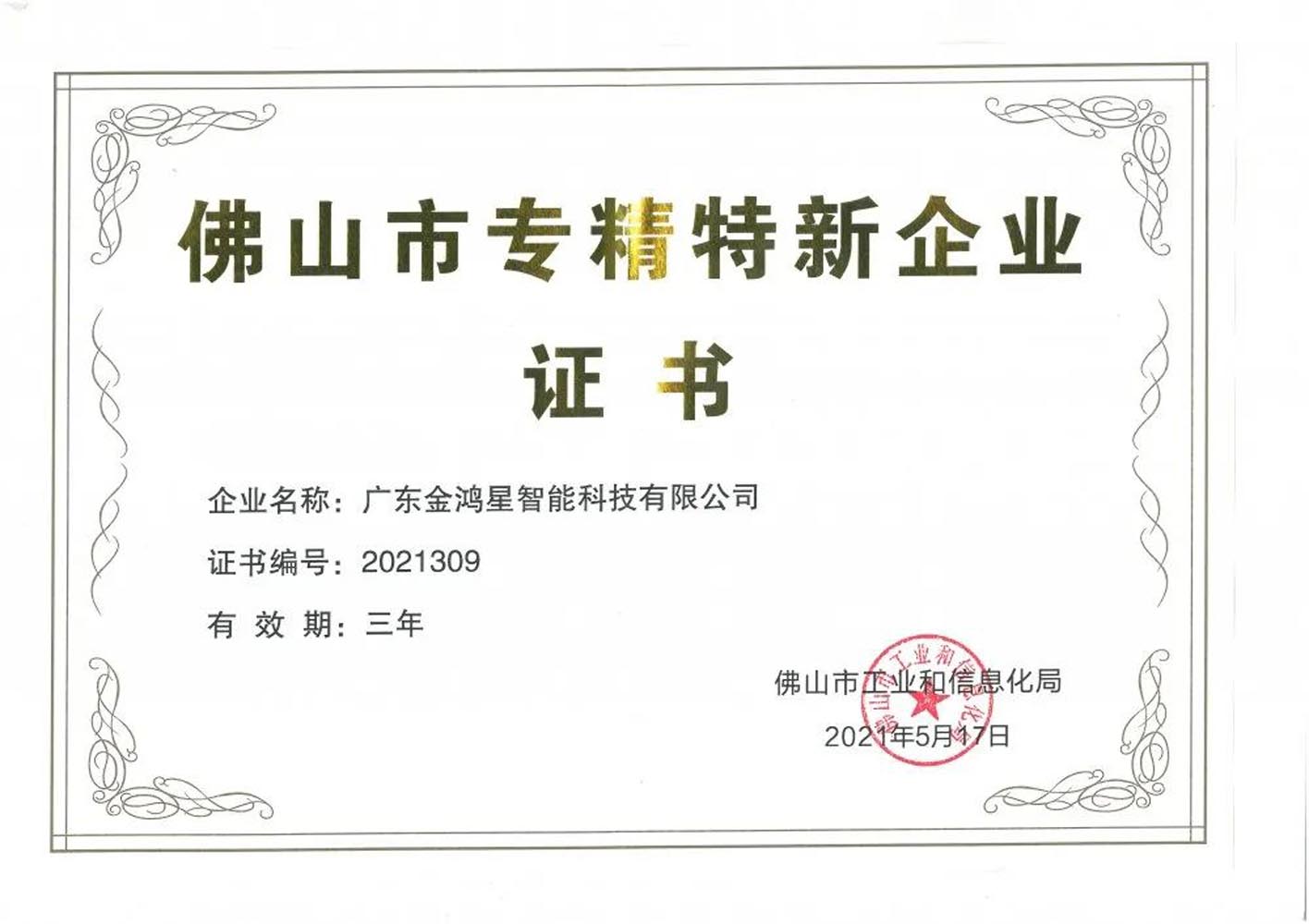 2021年5月26日,金鴻星智能科技有限公司榮獲佛山市工業(yè)和信息化局頒發(fā)的“專(zhuān)精特新”企業(yè)榮譽(yù)證書(shū)。這是上級(jí)政府部門(mén)對(duì)金鴻星科技在市場(chǎng)經(jīng)營(yíng)管理以及產(chǎn)品科技創(chuàng)新等方面實(shí)力的再次肯定。